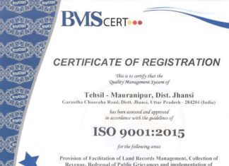 तहसील मऊरानीपुर को आईएसओ 9001:2015 प्रमाण पत्र