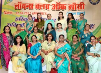 झांसी। लायंस क्लब ऑफ झांसी के तत्वावधान में महिला लायंस ने श्रावण माह में हरियाली तीज का उत्सव लायन अल्का अरोरा के मुख्य आतिथ्य में धूमधाम से मनाया।