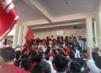 विद्युत संविदा कर्मचारियों द्वारा वेतन की मांग को लेकर प्रदर्शन