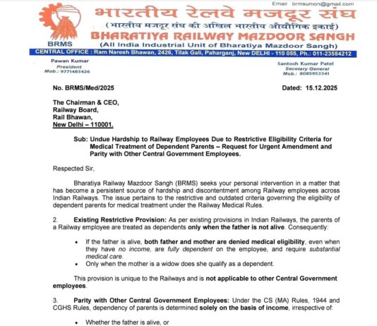 झांसी। भारतीय रेलवे मज़दूर संघ (BRMS) ने रेलवे बोर्ड के चेयरमैन‑cum‑CEO को विस्तृत पत्र भेजकर वह गंभीर मुद्दा उठा दिया है, जिससे हर रेलकर्मी...