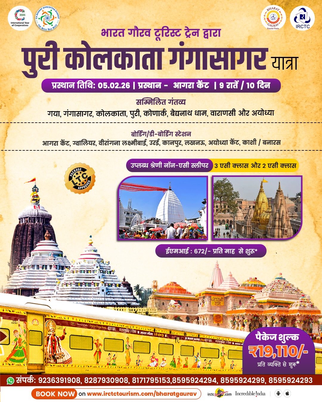 झांसी। इंडियन रेलवे केटरिंग एण्ड टूरिज्म कार्पोरेशन लि0 (आईआरसीटीसी) द्वारा आगरा कैंट रेलवे स्टेशन से भारत गौरव पर्यटक ट्रेन द्वारा गया, पुरी जगन्नाथ, कोणार्क मंदिर, कोलकाता, गंगासागर, बैद्यनाथ धाम, वाराणसी, अयोध्या की यात्रा का संचालन किया जा रहा है।