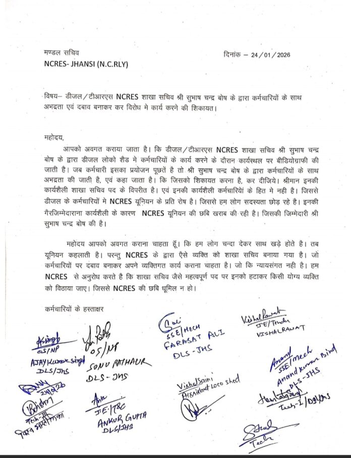 झांसी। नार्थ सेंट्रल इम्प्लॉइज असोसिएशन के मंडल सचिव को हस्ताक्षर युक्त पत्र के माध्यम से शिकायत की गई है कि डीजल / टीआरएस NCRES शाखा सचिव के द्वारा डीजल लोको शेड में कर्मचारियों के कार्य करने के दौरान कार्य स्थल पर वीडियोग्राफी की जाती है। जब कर्मचारी इसका प्रयोजन पूछते हैं तो उनके साथ अभद्रता की जाती है एवं कहा जाता है कि जिसको शिकायत करना है, कर दीजिये।