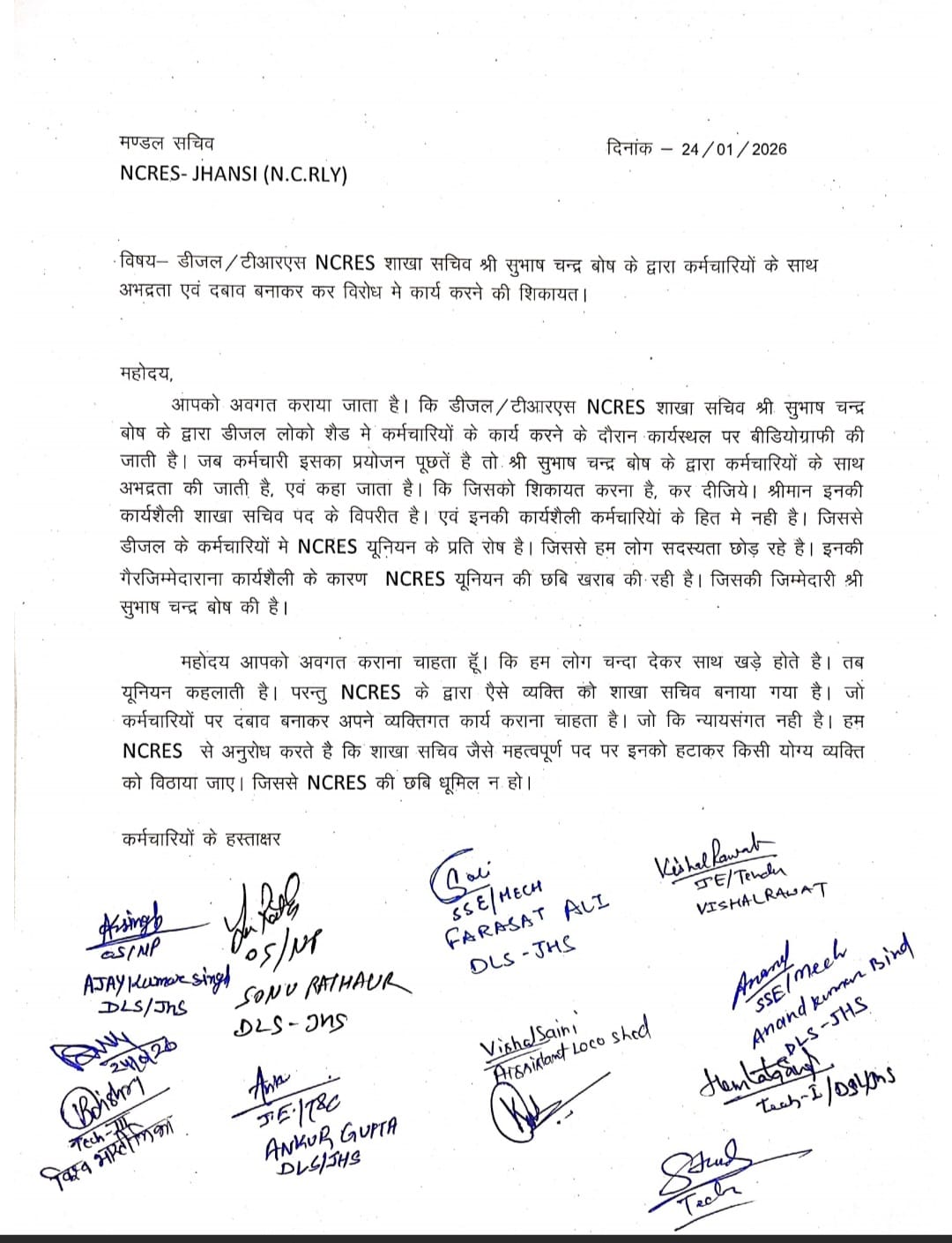 शिकायतकर्ताओं का आरोप है कि शाखा सचिव की उक्त कार्यशैली शाखा सचिव पद के विपरीत व कर्मचारियों के हित में नही है। इनकी गैरजिम्मेदाराना कार्यशैली के कारण NCRES यूनियन की छबि खराब की रही है जिससे डीजल के कर्मचारियों में NCRES के प्रति रोष व्याप्त हो रहा है। पत्र के माध्यम से शिकायतकर्ताओं ने सदस्यता छोड़ने की चेतावनी दी है।