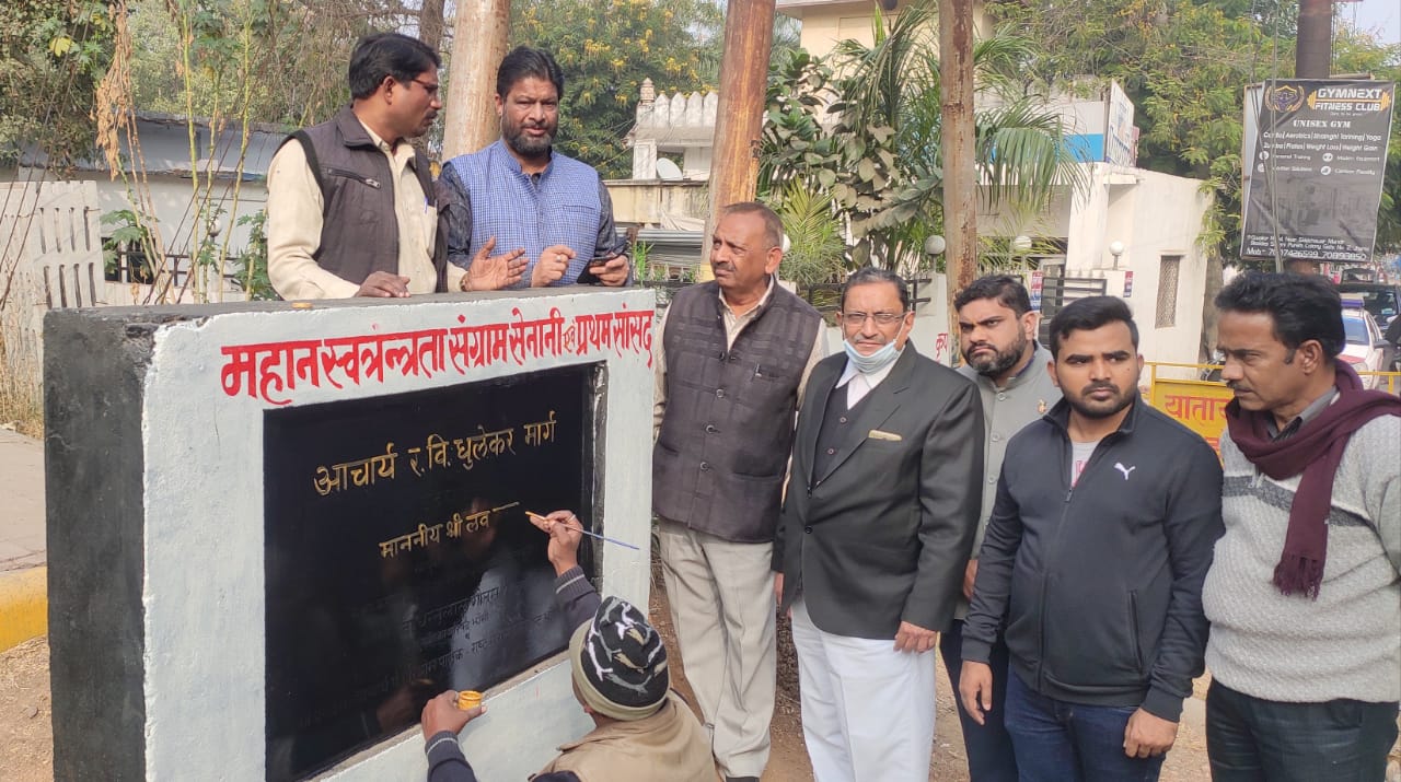 झांसी। आज पूर्व केंद्रीय मंत्री प्रदीप जैन आदित्य, एडवोकेट राम प्रकाश अग्रवाल, प्रकाश गुप्ता, अरविंद वशिष्ठ, मनीराम कुशवाहा, अमीरचंद आर्य, विनय उपाध्याय, दीपक शिवहरे, सग्गू गोस्वामी, उमेश चंद्र सविता आदि कांग्रेसियों ने ग्वालियर रोड पहुंच कर शिलापट पर लिखा नई बस्ती पुलिस चौकी मिटाकर उस पर पुनः आचार्य पंडित रघुनायक विनायक धुलेकर मार्ग अंकित करा कर सराहनीय कार्य किया। दरअसल, स्वतंत्रता संग्राम सेनानी, हिंदी के प्रबल पक्षधर एवं झांसी के प्रथम सांसद पंडित रघुनाथ विनायक धुलेकर की जयंती के अवसर पर 6 जनवरी 2020 को आयोजित गोष्टी में वक्ताओं ने पूर्व मंत्री प्रदीप जैन आदित्य का ध्यान आकर्षित कराया था कि ग्वालियर रोड सिद्धेश्वर मंदिर से बाहर दतिया गेट की ओर जाने वाले मार्ग का नामकरण पंडित रघुनाथ विनायक धुलेकर के नाम पर हुआ था तथा जिसका शिलान्यास 26 अक्टूबर 2000 को तत्कालीन कमिश्नर लव वर्मा द्वारा किया गया था। बाद में मार्ग से संबंधित शिलापट पर पुलिस विभाग द्वारा पुलिस चौकी नई बस्ती अंकित कर दिया गया है। जिसको लेकर कार्यक्रम में उपस्थित लोगों ने रोष व्यक्त किया था।