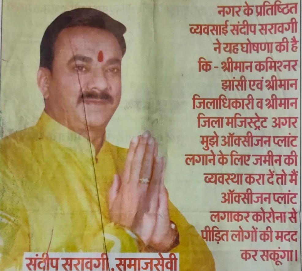 झांसी। कोरोना महामारी के दौरान आक्सीजन के अभाव में मरीजों की टूटती सांसें व परिजनों की टूटती आस को बचाने के लिए जहां कई समाजसेवी अपने अपने तरीके से रात दिन एक कर कर पीड़ितों की सेवा में जुटे हुए हैं । ऐसे में नगर के युवा समाजसेवी उद्यमी संदीप सरावगी ने ऑक्सीजन की कमी को दूर करने के लिए सरकार के पास एक प्रस्ताव भेजा है। उन्होंने कहा कि वह वर्तमान में ऑक्सीजन की कमी को देखते हुए झांसी में प्लांट लगाना चाहते हैं इसके लिए सरकार उनकी मदद करें।