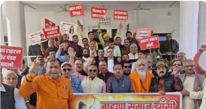 झांसी। ‘घूसखोर पंडित’ फिल्म के खिलाफ झांसी में भी ब्राह्मण समाज ने हाथों में बैनर और पोस्टर लेकर सड़क पर मार्च किया और कलक्ट्रेट में प्रदर्शन कर प्रधानमंत्री व मुख्यमंत्री के नाम ज्ञापन जिलाधिकारी के समकक्ष अधिकारी को सौंपते हुए आरोपियों को जेल भेजने व नेटफ्लिक्स पर बैन लगाने की मांग की गई।