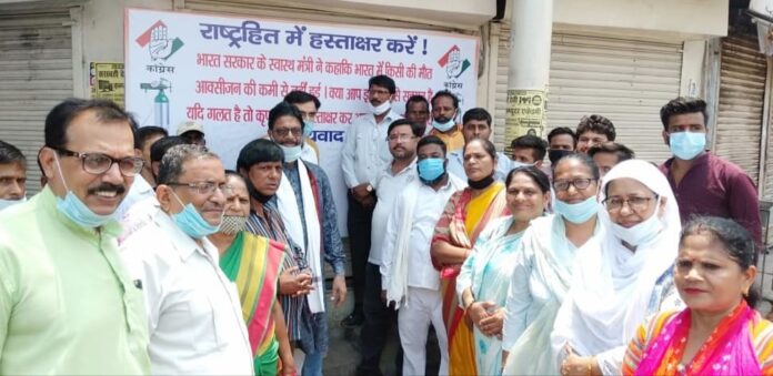 झांसी। पूर्व केंद्रीय राज्य मंत्री प्रदीप जैन आदित्य के नेतृत्व में एवं पूर्व झांसी मंडल प्रवक्ता राजेंद्र शर्मा एडवोकेट के संयोजन में कांग्रेस पार्टी द्वारा इलाइट चौराहे पर भारत सरकार के स्वास्थ्य मंत्री के झूठे बयान “देश में किसी की भी मौत ऑक्सीजन की कमी से नहीं हुई” के विरोध स्वरूप एक होडिंग पर हस्ताक्षर करके अपना विरोध दर्ज किया गया और इस्तीफे की मांग की।हस्ताक्षर अभियान का संचालन विजय भारद्वाज ने किया।
