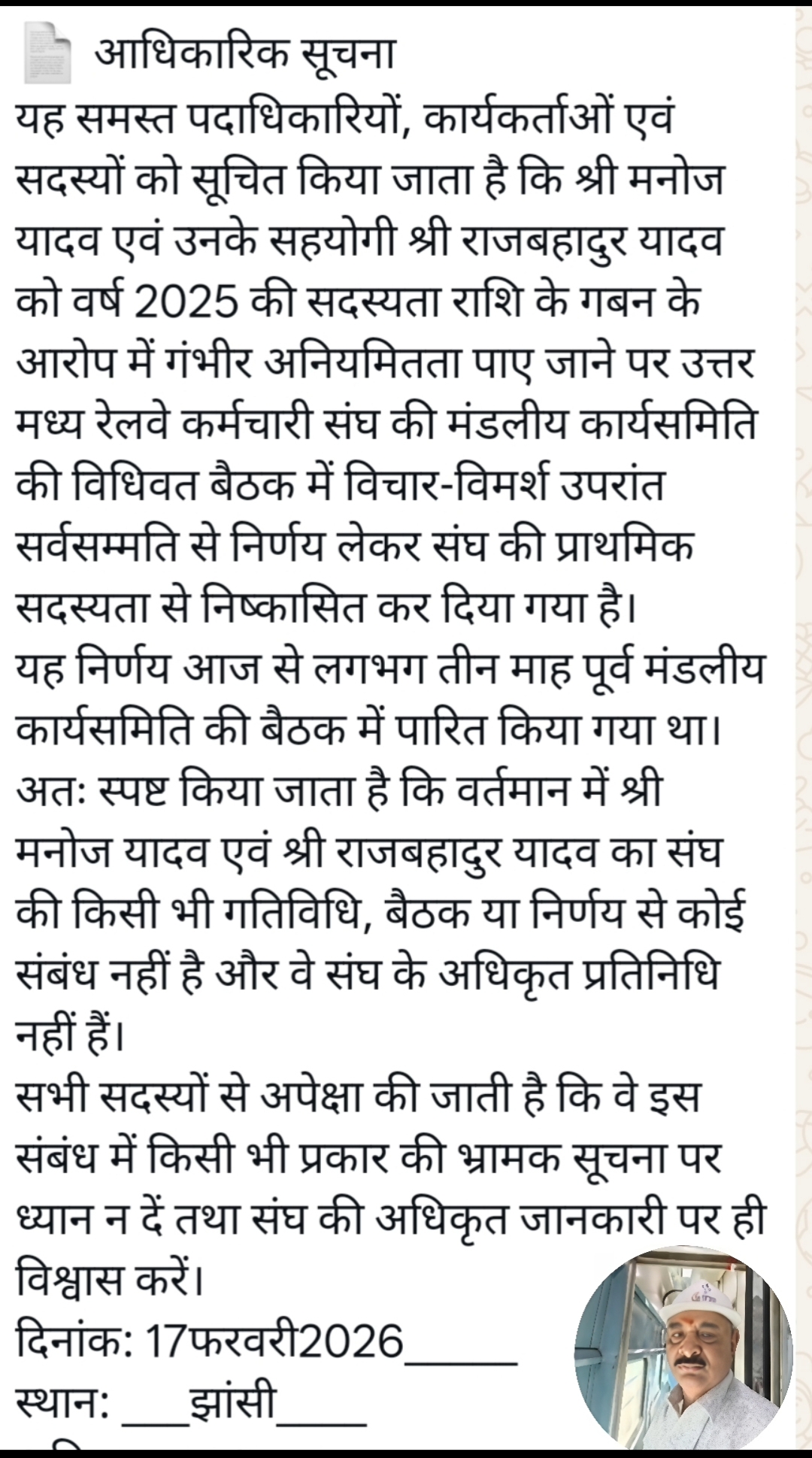 उन्होंने आधिकारिक सूचना के माध्यम से यह समस्त पदाधिकारियों, कार्यकर्ताओं एवं सदस्यों को सूचित किया है कि मनोज यादव एवं उनके सहयोगी राजबहादुर यादव को वर्ष 2025 की संगठन की सदस्यता राशि के गबन के आरोप में गंभीर अनियमितता पाए जाने पर उत्तर मध्य रेलवे कर्मचारी संघ की मंडलीय कार्यसमिति की विधिवत बैठक में विचार-विमर्श उपरांत सर्वसम्मति से निर्णय लेकर संघ की प्राथमिक सदस्यता से निष्कासित कर दिया गया है।