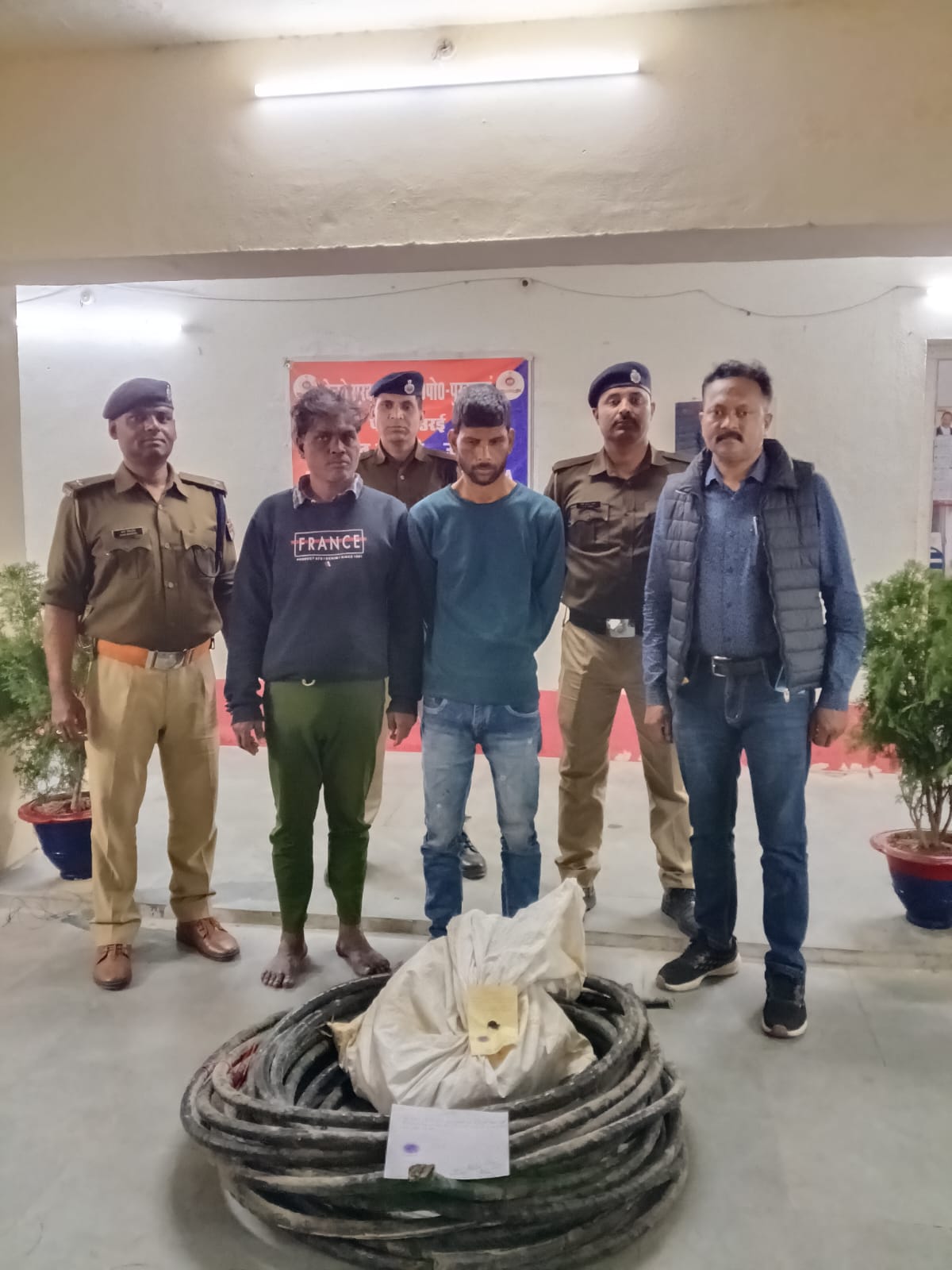 आरपीएफ टीम द्वारा 02 मार्च को आउट पोस्ट पुखरायां पर पूर्व में पंजीकृत धारा 3 RP(UP) एक्ट एवं 174-सी रेलवे एक्ट के अंतर्गत अज्ञात आरोपियों की सुरागरसी एवं पतारसी के दौरान दो अभियुक्तों को गिरफ्तार किया गया। तलाशी के दौरान आरोपियों के कब्जे से रेलवे सिग्नल विभाग की चोरी की गई लगभग पूर्ण केबिल बरामद कर ली। बरामद रेल संपत्ति की अनुमानित कीमत ₹6,000/- आंकी गई है।