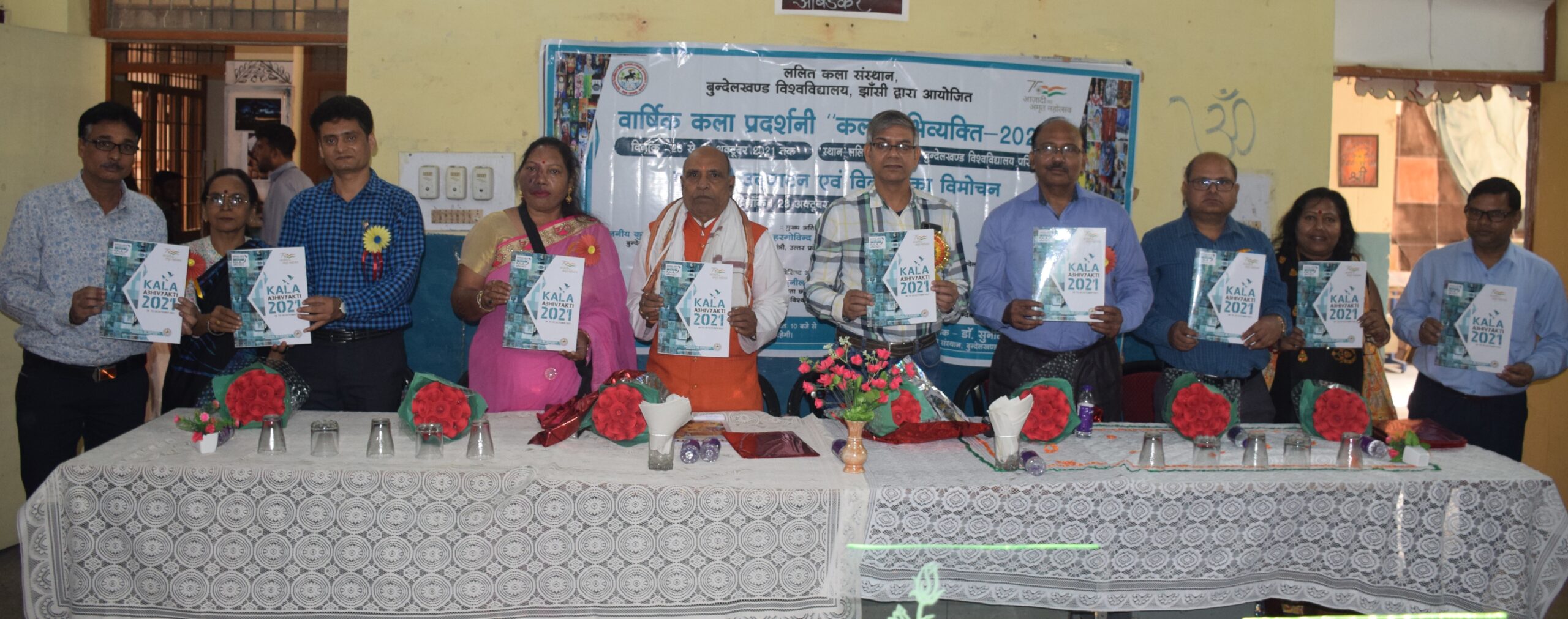 झांसी। ललित कला संस्थान बुंदेलखंड विश्वविद्यालय झांसी के ललित कला संस्थान में तीन दिवसीय वार्षिक कला प्रदर्शनी का उद्घाटन प्रति कुलपति प्रो. एस.पी .कटियार की अध्यक्षता, डॉ हरगोविंद कुशवाहा राज्य मंत्री उत्तर प्रदेश सरकार के मुख्य अतिथि, डॉ. एस.के. दुबे क्षेत्रीय पुरातत्व सर्वेक्षण अधिकारी, डॉ. पुनीत बिसारिया विभागा अध्यक्ष हिंदी विभाग, सुभाष चंद्र श्रीवास्तव केंद्रीय विद्यालय नंबर 3, डॉ. कुंती हरी राम के विशिष्ट आतिथ्य में हुआ ।