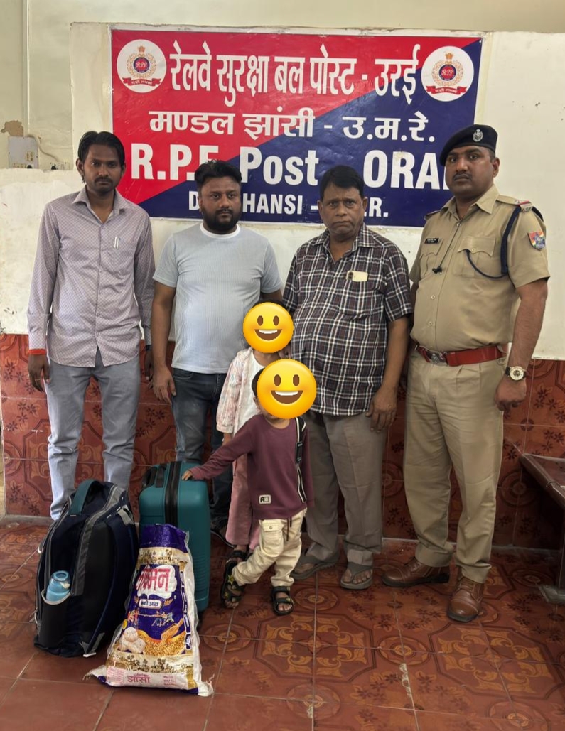 उक्त गाड़ी के उरई रेलवे स्टेशन के प्लेटफार्म नंबर 01 पर आगमन पर उक्त कोच को अटेंड किया तो दो नाबालिक बच्चे लड़की हिबजा (06 वर्ष), लड़का इजहान (03 वर्ष) मिले जिनको उनके पिता व परिजनों द्वारा पहचान की गई। बाद बच्चों को उक्त कोच से उतारकर पोस्ट से आवश्यक दिशा-निर्देश प्राप्त कर चाइल्ड लाइंस उरई के समक्ष पाक-साफ स्वास्थ्य हालत में सकुशल उनके पिता, परिजनों को सामान सहित सुपुर्द किया।