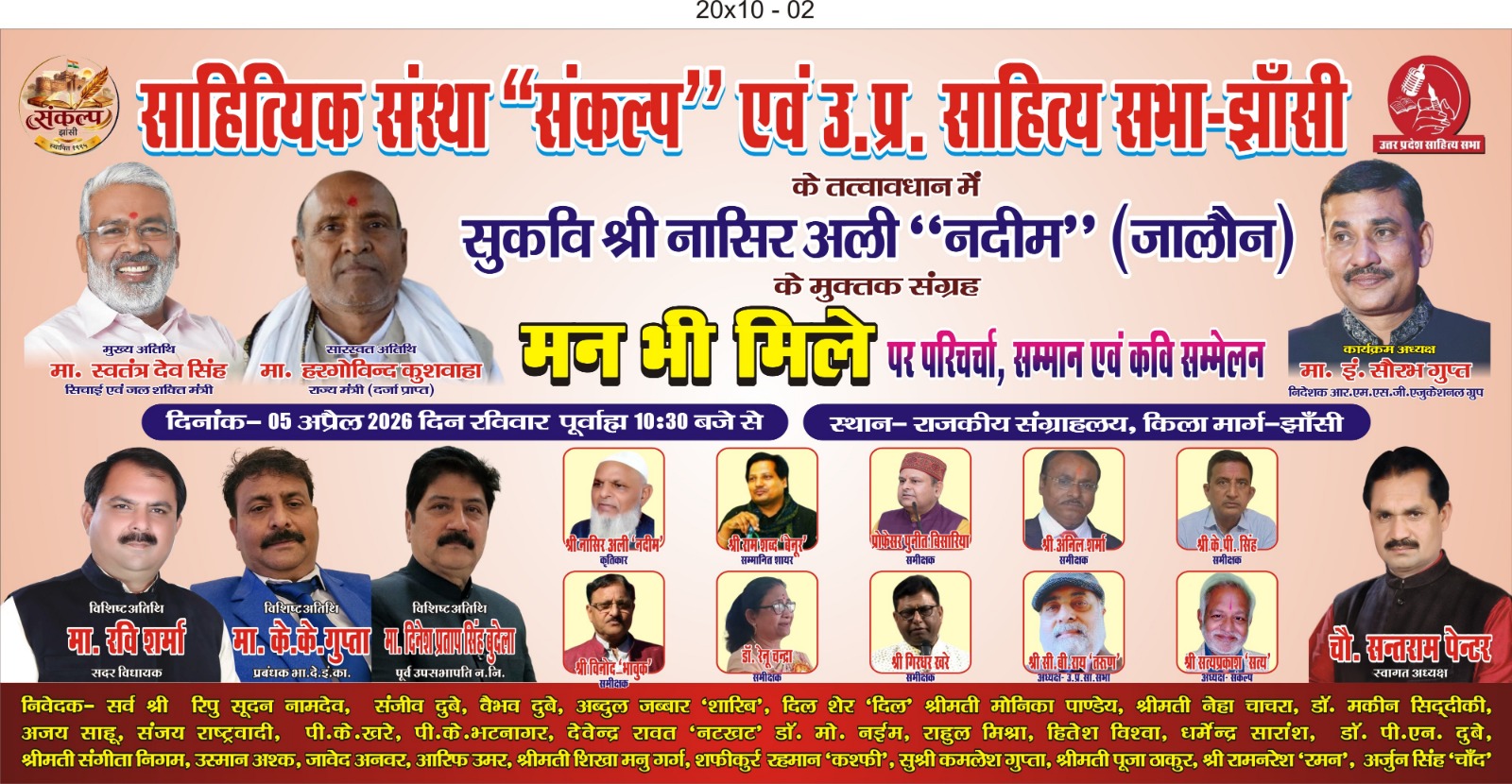 झांसी। साहित्यिक संस्था संकल्प झाँसी एवं उत्तर प्रदेश साहित्य सभा झाँसी के संयुक्त तत्त्वावधान में 5अप्रैल 2026 को राजकीय संग्रहालय में प्रातः 10:30 बजे से सम्मान समारोह एवं कवि सम्मेलन का आयोजन किया गया है। समारोह के मुख्य अतिथि उत्तर प्रदेश के जल संसाधन मंत्री स्वतंत्र देव सिंह होंगे। विशिष्ट अतिथि के रूप में दर्जा प्राप्त राज्य मंत्री हरगोविंद कुशवाहा, नगर विधायक रवि शर्मा होंगे। कार्यक्रम की अध्यक्षता राष्ट्रकवि मैथिलीशरण गुप्त के सुपौत्र इंजीनियर सौरभ गुप्ता करेंगे।