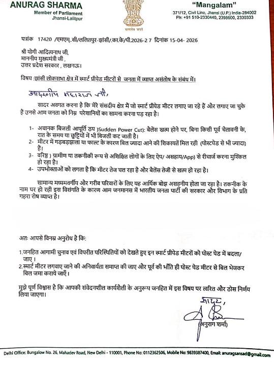 झांसी। झांसी – ललितपुर सांसद अनुराग शर्मा ने भी मुख्यमंत्री योगी आदित्यनाथ को लिखे पत्र में स्पष्ट किया है कि स्मार्ट मीटर को लेकर जनता में भाजपा की सरकार व विभाग के प्रति गहरा रोष व्याप्त है। जनहित में इस विषय पर त्वरित और ठोस निर्णय लिया जाए।