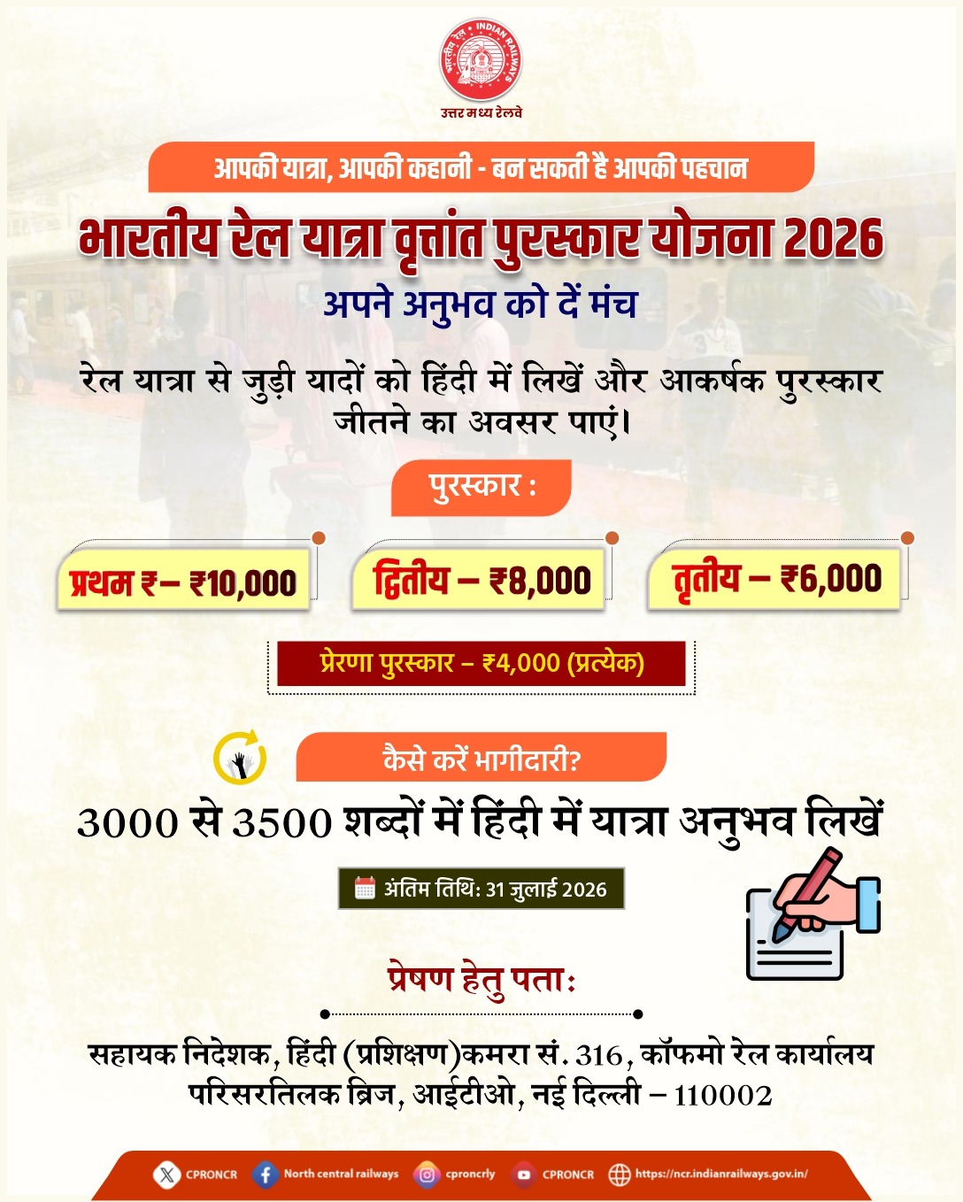 प्रयागराज। भारतीय रेल केवल परिवहन का माध्यम नहीं, बल्कि करोड़ों यात्रियों के अनुभवों, स्मृतियों और भावनाओं से जुड़ी एक जीवंत यात्रा है। इन्हीं अनुभवों को अभिव्यक्ति देने तथा उनके माध्यम से रेल सेवाओं को और अधिक यात्री-अनुकूल बनाने के उद्देश्य से रेल मंत्रालय (रेलवे बोर्ड) द्वारा “रेल यात्रा वृत्तांत पुरस्कार योजना–2026” का आयोजन किया जा रहा है। यह योजना अखिल भारतीय स्तर पर संचालित है और हिंदी भाषा में सृजनात्मक लेखन को प्रोत्साहित करने की दिशा में एक महत्वपूर्ण पहल है।