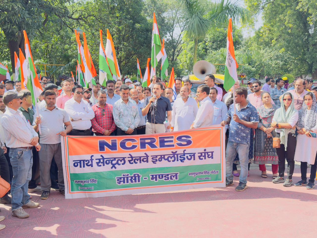 दोपहर 12.30 बजे वीरांगना लक्ष्मी बाई झांसी स्टेशन के सामने स्थित नार्थ सेण्ट्रल रेलवे इम्प्लाॅईज संघ के मंडल कार्यालय शुक्ल सदन से कर्मचारियों ने जुलूस निकाला। जुलूस मंडल रेल प्रबंधक कार्यालय के सामने द्वार सभा में परिवर्तित हो गया। इस दौरान मांगों को लेकर आवाज बुलंद करते हुए मंडलीय पदाधिकारी प्रधानमंत्री भारत सरकार के नाम संबोधित ज्ञापन अपर मंडल रेल प्रबंधक (बुनियाद) को सौंपा |