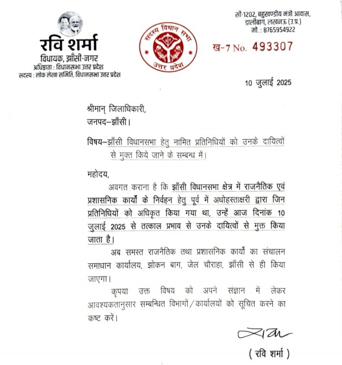 झांसी । सदर विधायक रवि शर्मा ने झांसी विधानसभा क्षेत्र में राजनैतिक एवं प्रशासनिक कार्यों के निर्वहन हेतु पूर्व में उनके द्वारा जिन प्रतिनिधियों को अधिकृत किया गया था, उन्हें 10 जुलाई 2025 से तत्काल प्रभाव से उनके दायित्वों से मुक्त कर दिया है।