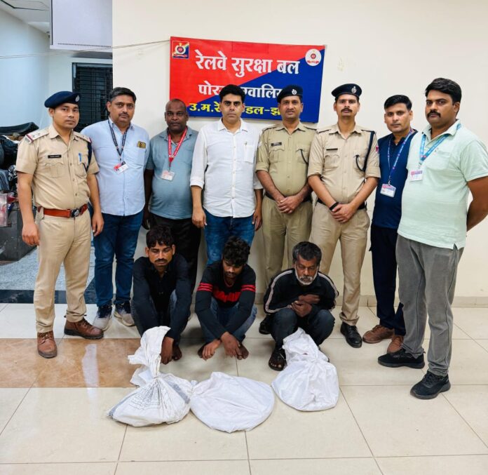 ग्वालियर द्वारा ग्वालियर रेलवे स्टेशन यार्ड से तीन संदिग्धों को रेल संपत्ति चुरा कर ले जाते हुए रंगे हाथों गिरफ्तार किया गया।