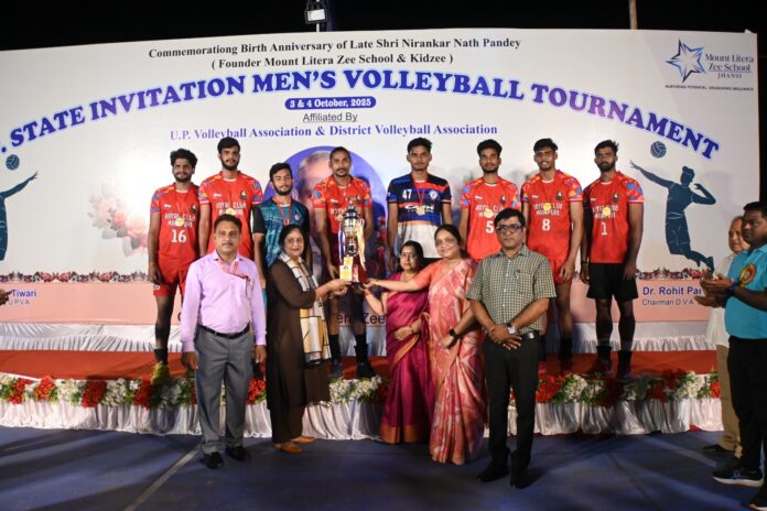 झांसी। स्व निरंकार नाथ पांडे की स्मृति में दो दिवसीय उत्तर प्रदेश स्टेट वॉलीबॉल टूर्नामेंट माउंट लिट्रा जी स्कूल में फाइनल एवं समापन समारोह संपन्न हुआ। अतिथि गण आलोक शांडिल्य, संजय पटवारी व्यापारी नेता, सुबोध खांडेकर अंतरराष्ट्रीय हॉकी खिलाड़ी, इब्राहिम खान हॉकी खिलाड़ी, संजीव सरावगी, अवधेश निरंजन अध्यक्ष विवेक निरंजन खेल अकादमी, अर्जुन सिंह, बृजेंद्र यादव, कपिल गर्ग, संजय भारती, वाहिद खान, सुनील शर्मा, चंद्र मोहन राय, सत्येंद्र पाल सिंह परिहार, आदित्य तिवारी, डॉ विवेक बाजपेई, पुनीत श्रीवास्तव रहे।