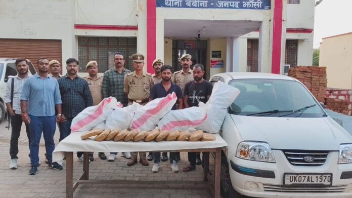 झांसी। एसटीएफ लखनऊ ने थाना बबीना पुलिस के साथ कार्रवाई करते हुए बबीना टोल प्लाजा के पास झांसी–ललितपुर हाईवे, थाना क्षेत्र बबीना में चेकिंग के दौरान एक हुंडई सैंट्रो कार (संख्या UK 07 AL 1970) को रोककर तलाशी ली गई। तलाशी के दौरान वाहन से 64 किलो 100 ग्राम अवैध गांजा बरामद किया गया, जिसकी अनुमानित बाजार कीमत लगभग ₹30 लाख आंकी गई है। यह गांजा की खेप छोटे छोटे 134 पैकेट में रखी थी।