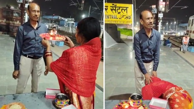 दरअसल जिस व्यक्ति की पूजा की गई वह ट्रेन ड्राइवर महेश कुमार थे, जिन्हें करवाचौथ पर छुट्टी नहीं मिली। इस पर उनकी पत्नी स्टेशन आ गईं और वहीं त्योहार मनाया। प्लेटफार्म पर चलनी से पति को देखने का वीडियो वायरल हो गया तो रेलवे अफसरों तक चर्चा हो रही है। कानपुर देहात के झींझक मूल निवासी महेश कुमार लोको पायलट हैं और बर्रा में रहते हैं। वीडियो शुक्रवार की रात नौ बजे का बताया जा रहा है।