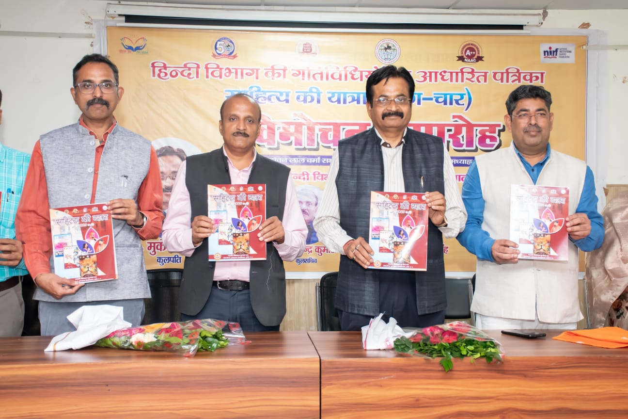 कुलसचिव ज्ञानेंद्र कुमार ने कहा कि “साहित्य की यात्रा” जैसी रचनात्मक पहलें विद्यार्थियों को चिंतनशील बनाती हैं और उन्हें अपने विचार अभिव्यक्त करने का मंच प्रदान करती हैं। उन्होंने हिंदी विभाग को इस सामूहिक प्रयास के लिए बधाई दी। संपत्ति अधिकारी प्रो. सौरभ श्रीवास्तव ने कहा कि यह प्रकाशन न केवल विभागीय प्रतिभाओं को प्रोत्साहित करेगा, बल्कि आने वाली पीढ़ियों के लिए प्रेरणा का स्रोत बनेगा। विभाग के संस्थापक अधिकत प्रो. मुन्ना तिवारी ने विभाग के उन्नयन में महत्वपूर्ण भूमिका निभाई है। उन्होंने विद्यार्थियों से आग्रह किया कि वे इसी तरह की सृजनात्मक गतिविधियों में बढ़-चढ़कर भाग लें।