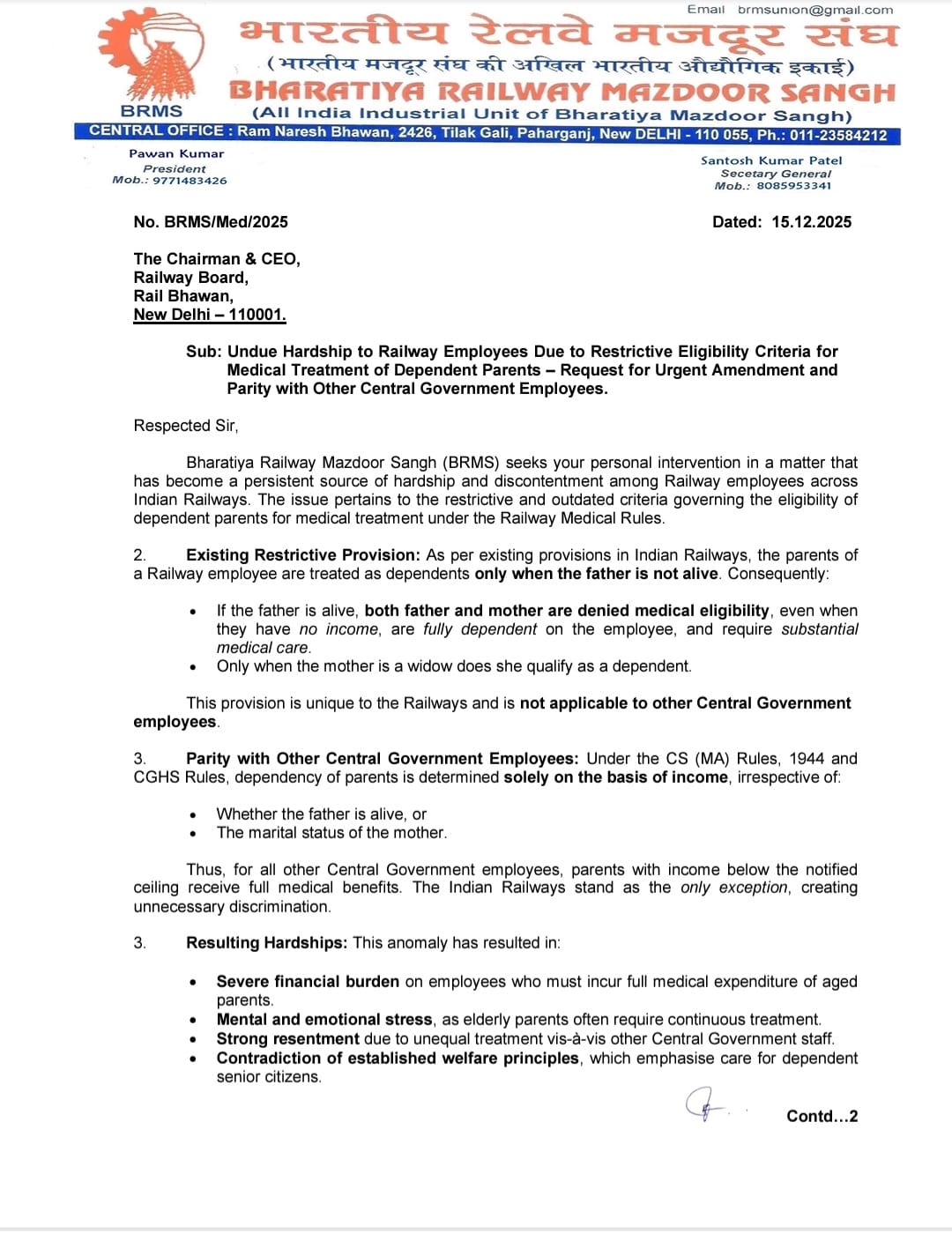 झांसी। भारतीय रेलवे मज़दूर संघ (BRMS) ने रेलवे बोर्ड के चेयरमैन‑cum‑CEO को विस्तृत पत्र भेजकर वह गंभीर मुद्दा उठा दिया है, जिससे हर रेलकर्मी जूझ रहा है – आश्रित माता‑पिता के लिए मेडिकल सुविधा पर लगे अव्यावहारिक प्रतिबंध। वर्तमान नियमों के कारण जब तक पिता जीवित हैं, माता‑पिता को आश्रित मानने में भारी दिक्कत आती है, जबकि वे निःआय, बीमार और पूरी तरह हमारे ऊपर निर्भर रहते हैं।