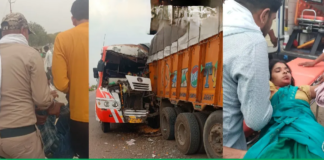 हाईवे पर खड़े ट्रक से भिड़ी बस